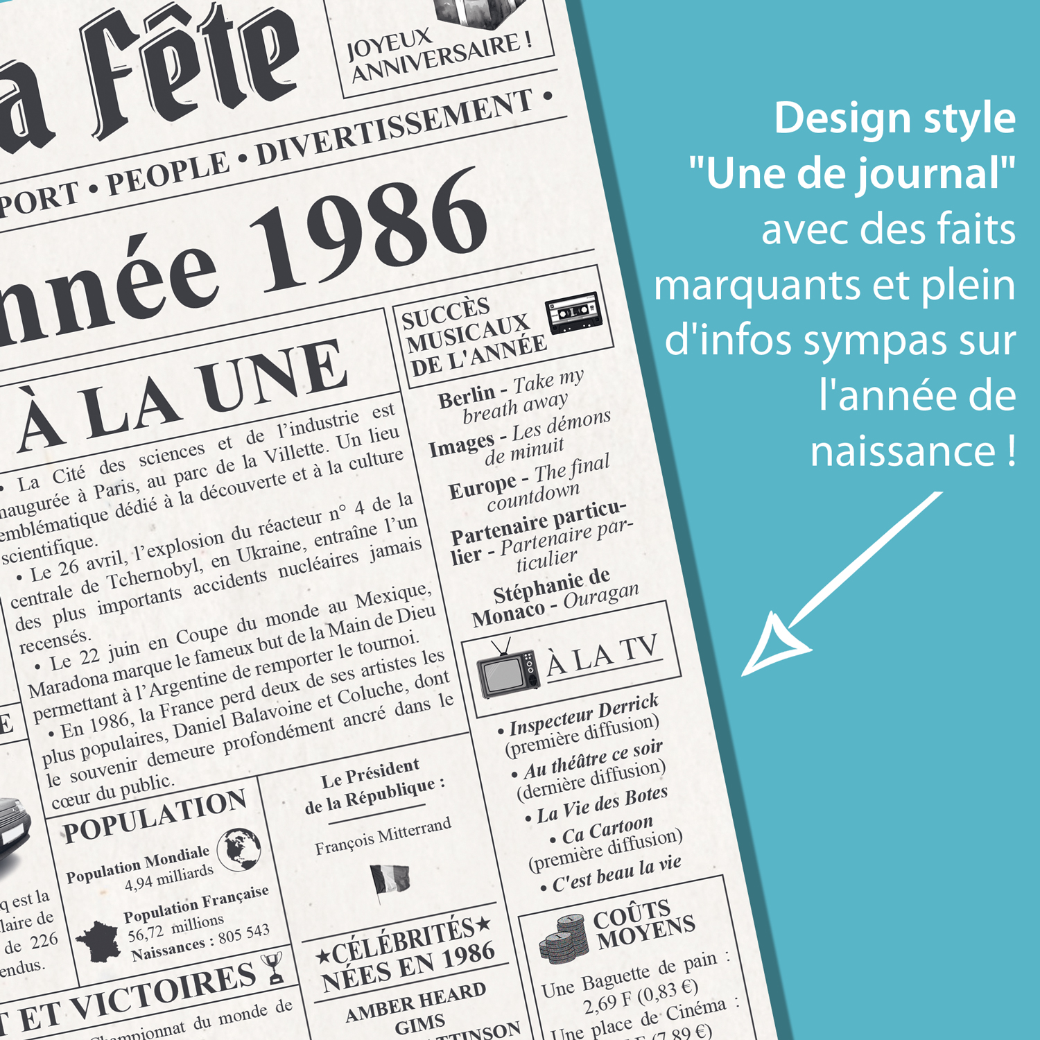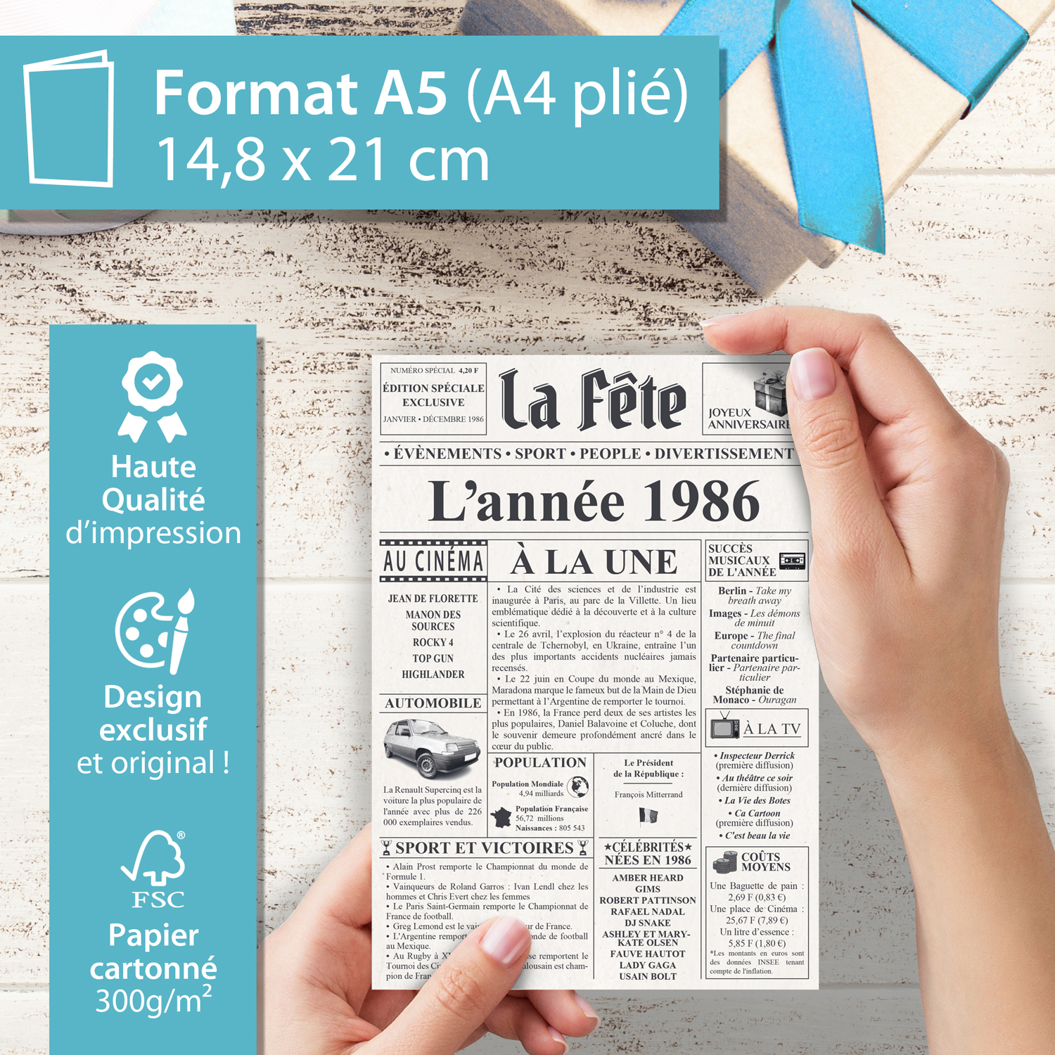 - Design Unique et Original : Notre carte d’anniversaire se distingue par son design sympa qui rappelle la première page d’un journal. Elle présente diverses informations captivantes de l’année de naissance du destinataire, tels que des faits marquants, les films populaires au cinéma, les succès musicaux, les victoires sportives, et les émissions télévisées incontournables de cette année-là.